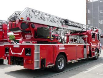 Keywords: Hino-Magirusrear.jpg en Hino Magirus fire engine ja マギルス架装のはしご車 京国際防災消防展にて撮影 own Photo by me Ypy31 2008-06-07 HINO Profia HINO fire engines Fire engines of Tokyo Magirus turntable ladders Red fire engines
