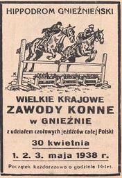 | Keywords: Hippodrom gnieźnieński - Wielkie zawody konne w Gnieźnie, 1938.jpg pl Reklama zawodów konnych na gnieźnieńskim hipodromie obecnie Stadion Miejski im płk Franciszka Hynka przy ul Wrzesińskiej 24 Ilustracja Polska 1938 nr 18; Wielkopolska Biblioteka Cyfrowa author 1938 Anonymous-EU Gniezno Hippodrome Gniezno in 1930s Unclear-PD-US-old-70 |