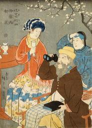 | Keywords: Hiroshige II, Amerika, Furansu, Nankin.jpg Amerika Fransu Nankin Japanese 米利加 仏蘭西 南京 America France Nanjing Print shows three spectators viewing an unseen object or event a woman holding a drinking vessel sits beside a man gazing through binoculars while a Chinese man touches his head It is unknown which person represents France and which represents the U S Medium 1 print on hōsho paper woodcut color ; 35 x 25 2 cm block 25 x 25 2 cm sheet LOC-image cph 3g10410 1860 Hiroshige II 広重歌 2代目 PD-Japan Utagawa Hiroshige II Personifications of the United States Personifications of France Personifications of China 1860 in art |