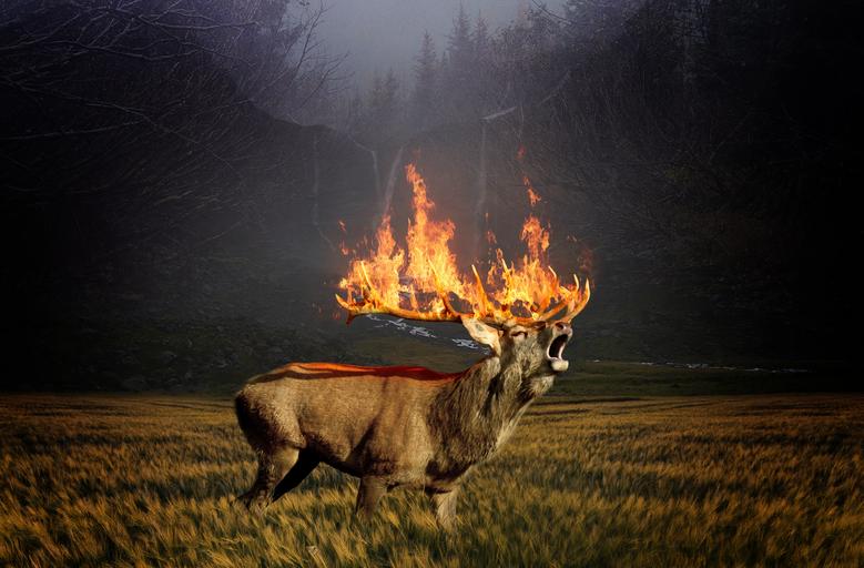 Keywords: hirsch roe deer forest brand forest fire fire eradication wild antler nature animal fallow deer red deer scheu damm wild animal world field trees destruction nature conservation wildlife photography landscape meadow wilderness