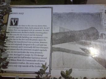 | Keywords: Historic James Fort plaque, Bridgetown.jpg Constitution River It reads James Fort Very close to this site was James Fort one of Bridgetown's forts built around 1670 In 1677 James Fort was equipped with 20 cannons In 1699 the Government decided to build a meeting place in this area for the Council and the General Assembly and the building was completed in 1701 In 1704 due to the dire need for prison space the building was transformed into a prison However it was not originally designed to be a jail and was rather insecure and it eventually fell into disrepair which meant that the prisoners escaped regularly In 1714 on one particular day every prisoner except one managed to escape In 1751 George Washington and his half brother Lawrence rented Bush Hill House from the Commander of James Fort Commander Groftan for seven weeks on Washington's only trip outside of the United States own CaribDigita 2010-10-06 Photos by User CaribDigita/Barbados Constitution River Plaques in Barbados History of Barbados Military of the United Kingdom 2010 in Barbados |