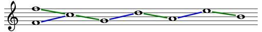 | Keywords: Historic way of building the diatonic scale.svg en Historic way of building the diatonic scale perfect fifths shown in blue and perfect fourths in red Construction historique de l'échelle diatonique les quintes montantes sont en bleu et les quartes descendantes sont en vert own Romainbehar 2010-07-12 Musical scales |