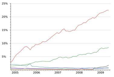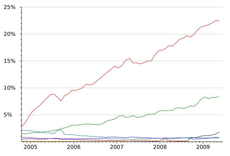 | Keywords: Historical browser market share.svg red Firefox green Safari teal Opera blue Netscape purple Mozilla black Chrome Orange Other en Historical market share of alternative web browsers Data is from October 2005 to May 2009 Source http //marketshare hitslink com/default aspx NetApplications Data is no longer available to public own ARC Gritt 2009-05-06 http //commons wikimedia org/wiki/File Webapps svg Line charts of web browser statistics | ||||