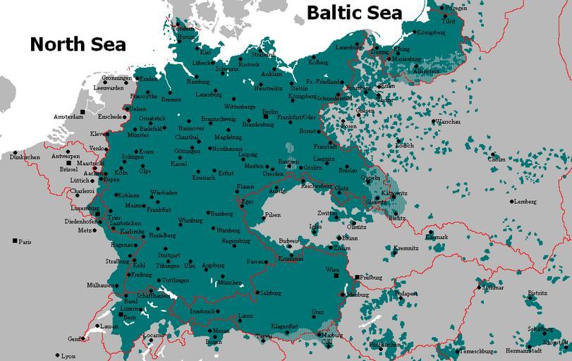| Keywords: Historical German linguistical area.PNG fact disputed en The available map is based mainly on the language map Fischer of the information Atlas Federal Republic of Germany Fischer paperback publishing house S 63 from the year 1990 Besides calibrations with the dtv Atlas found to the German language German paperbacks publishing house S 230/231 and the Volkskunde - history of the German way of life and culture Elard Hugo Meyer S 363 from the year 1898 instead of Furthermore also the books became the Germanic languages - their history included in fundamentals Claus Juergen Hutterer 1975 of the Akademiai Kiado Sudeten German regional studies Hans Krebs/Emil Lehmann 1992 east Prussian regional studies Walther Franz 1993 all this in the Arndt publishing house appeared to Budapest Schlesien regional studies Alfred Pudelko 1993 Also - probably most exact map of the German linguistic area - the dialect map the spreading of the Germans in Europe had completely large influence 1844-1888 Heinrich Nabert 1890 which developed in the course of 30 years and which was presented as reproduction with the federation for German writing and language 1994 series of publications number 12 again Furthermore an alignment with the books became Atlas contemporary history Europe in 20 Century Manfred Scheuch 1992 appeared in the publishing house Christian Brandstaetter S 51 and small Atlas to German territorial history P 137 of the culture donation of the German refugees 1990 the Putzger historical world Atlas Cornelsen publishing house 1991 - there S 99 - made Furthermore the information of the books historical and political geography of Europe N J G Pounds the lecturer of the geographical faculty of the University of Cambridge appeared 1950 in George Westermann publishing house P 296 319 327 of Germany borders in history Alexander Demandt 1990 from the publishing house C H Beck Munich P 66 and the language map of area and population losses of the German Reich and German Austria after the year 1918 Dr Karl Hans Ertl 1996 from the row German history in 20 Century of the German publishing house company rose home For the situation of the German settlement area Pounds on S gives 295 on In Czechoslovakia 3 5 millions In Poland including Danzigs 2 2 millions In Russia 1 6 millions In France 1 5 millions In Romania 0 9 millions In Yugoslavia 0 7 millions In the Baltic 0 27 millions In Italy 0 25 millions In Hungary 0 25 millions and in Belgium 0 15 millions Dr Ertl indicates the following numbers for the tuning areas in west and east Prussia east Prussia population to 8 10 1919 577 001 enfranchised 422 067 voices for Germany 363 159 97 9 voices for Poland 7 924 West Prussia Population to 8 10 1919 164 183 enfranchised 121 176 voices for Germany 96 895 92 4 voices for Poland 7 947 For the areas Memel Soldauer hit a corner Danzig and environment retired west Prussia Brandenburg Pommern and Posen which had to be retired without tuning indicates to Ertl P 72 speaker numbers after native language Memelgebiet German 71 781 speakers German and others 2 028 speakers Polish 126 speakers Lithuanian 67 138 speakers other languages 165 speakers Soldauer hit a corner German 9 232 speakers German and others 895 speakers Polish 5 289 speakers Masurian 9 134 speakers other languages 237 speakers Danzig German 315 336 speakers German and others 3 039 speakers Polish 9 490 speakers Kashubian 2 254 speakers other languages 511 speakers retired west Prussia Danziger surrounding countryside German 411 621 speakers German and others 14 807 speakers Polish 104 585 speakers other languages 410 speakers Brandenburg no language prevailing there uninhabited area Pommern German 180 speakers Polish 44 speakers Posen German 699 859 speakers German and others 11 194 speakers Polish 1 263 346 speakers Kashubian and Masurian 69 speakers other languages 1 993 speakers It is also expressly mentioned that according to the official census of the German Reich of the yearly 1914 alone the province west Prussia had a German population portion of over 63 ; however in the province floats were those Poland the clear population of majority But in the time between 1920 and 23 from Poland above all west Prussia and east Upper Silesia approximately 1 1 millions Germans were illegally driven out That had even some objections of the German Reich with the voelkerbund in Geneva according to since Poland refused those to the German of assured minority rights and/or stepped these with feet For the retired east Upper Silesia Ertl gives the following numbers to P 83 the voting result was however for Poland and concomitantly for France disappointing it obviously it became that with the tuning the majority of the water-Polish speaking population of Upper Silesia had decided for whereabouts with the German Reich For the German Reich at that time 702 045 voices 59 4 were delivered for Poland 479 232 40 6 Only in the circles Beuthen country large Strelitz Kattowitz country Pless Rybnik and Tarnowitz a weak became sig Polish majority obtains For the later Sudetenland and the language islands in Zentralboehmen Ertl P 146 indicates the following numbers Deutschboehmen German 2 070 438 Czechs 116 275 Sudetenland German 643 804 Czechs 25 028 Boehmerwaldgau German 176 237; Czechs 6 131 Suedmaehren German 155 791 Czechs 66 633 All numbers for 1919 see also for this the representation maps on S 150/151 The explanation to the dark-green color <span style background-color DarkCyan > </span> It shows the German settlement areas after the census from 1910 while the state borders were selected of 1937 in order to point out which area after 1919 from the German Reich and/or from Austria Hungary was separated agrees there the representation map really minimum with the reality of 1937 however German became there nevertheless still spoken; anyhow isolates still en wikipedia GijsvdL CommonsHelper 2006-07-14 Rex Germanus wikipedia en File German language in 1910 png not showing dutch as 