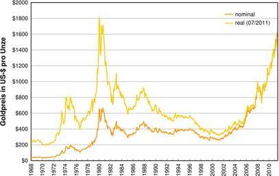 | Keywords: Historical price of gold 07-2011.svg Goldpreis in US- je Unze an der New York Mercantile Exchange Stand Juli 2011 Price of gold on New York Mercantile Exchange in US per fine ounce as of July 2011 CPI-U ftp //ftp bls gov/pub/special requests/cpi/cpiai txt and COMEX http //www wrenresearch com au/downloads/files/mgold csv 2010-08-28 Sponk <span class signature-talk >talk</span> File Historical price of gold 02-2010 svg Translation possible Data <pre> 01/1968 35 20 233 21 02/1968 35 20 232 53 03/1968 39 40 259 51 04/1968 39 10 256 79 05/1968 41 30 270 45 06/1968 41 00 266 94 07/1968 38 75 250 84 08/1968 39 90 257 55 09/1968 10/1968 39 50 252 80 11/1968 40 62 259 24 12/1968 41 72 265 51 01/1969 42 52 269 84 02/1969 42 70 269 47 03/1969 43 40 271 61 04/1969 43 60 271 36 05/1969 43 37 269 18 06/1969 40 90 252 46 07/1969 41 47 254 59 08/1969 40 92 249 86 09/1969 40 85 248 76 10/1969 40 00 242 28 11/1969 35 60 214 48 12/1969 35 17 210 76 01/1970 34 83 208 17 02/1970 34 96 207 85 03/1970 35 10 207 59 04/1970 35 95 210 96 05/1970 35 96 210 47 06/1970 35 40 206 12 07/1970 35 30 204 49 08/1970 35 25 204 20 09/1970 36 23 208 80 10/1970 38 00 217 89 11/1970 37 55 214 23 12/1970 37 40 212 30 01/1971 38 05 215 99 02/1971 38 75 219 41 03/1971 38 82 219 26 04/1971 39 20 220 85 05/1971 40 92 229 40 06/1971 40 15 223 42 07/1971 42 90 238 13 08/1971 42 85 237 27 09/1971 42 65 236 17 10/1971 42 50 234 76 11/1971 43 40 239 73 12/1971 43 55 239 39 01/1972 46 20 253 96 02/1972 48 64 266 07 03/1972 48 40 264 12 04/1972 49 30 268 38 05/1972 59 40 322 59 06/1972 64 00 346 74 07/1972 66 50 358 56 08/1972 66 85 359 59 09/1972 68 75 368 93 10/1972 64 75 345 83 11/1972 63 55 338 62 12/1972 65 00 345 53 01/1973 68 80 364 87 02/1973 82 00 431 83 03/1973 90 75 473 50 04/1973 90 70 469 98 05/1973 126 00 648 43 06/1973 122 00 623 59 07/1973 115 60 589 54 08/1973 105 10 526 48 09/1973 97 75 488 58 10/1973 98 00 485 53 11/1973 105 50 519 28 12/1973 111 75 546 47 01/1974 137 50 666 62 02/1974 175 00 837 63 03/1974 172 25 814 12 04/1974 174 70 822 26 05/1974 154 00 715 88 06/1974 149 75 690 45 07/1974 159 00 727 16 08/1974 152 50 689 06 09/1974 147 50 658 57 10/1974 168 25 743 86 11/1974 186 00 815 95 12/1974 193 00 840 13 01/1975 176 50 765 36 02/1975 185 00 796 11 03/1975 176 75 757 72 04/1975 167 05 713 43 05/1975 172 00 730 42 06/1975 162 40 684 51 07/1975 168 40 701 94 08/1975 161 85 673 40 09/1975 128 75 532 74 10/1975 142 70 587 23 11/1975 141 40 577 67 12/1975 140 75 572 95 01/1976 126 25 513 00 02/1976 132 45 536 26 03/1976 128 70 520 15 04/1976 128 70 518 29 05/1976 124 50 497 83 06/1976 123 70 492 02 07/1976 114 15 451 65 08/1976 104 38 410 83 09/1976 116 25 455 96 10/1976 124 00 483 84 11/1976 130 50 508 32 12/1976 134 63 522 61 01/1977 132 38 511 24 02/1977 143 13 547 14 03/1977 148 88 565 30 04/1977 147 38 554 94 05/1977 143 20 536 52 06/1977 143 13 532 72 07/1977 144 38 534 73 08/1977 146 13 539 44 09/1977 154 38 568 04 10/1977 161 63 592 79 11/1977 160 13 584 44 12/1977 165 13 600 75 01/1978 175 88 635 76 02/1978 182 63 655 96 03/1978 183 63 654 35 04/1978 170 63 603 27 05/1978 184 38 645 82 06/1978 183 38 635 42 07/1978 200 63 689 90 08/1978 208 13 712 44 09/1978 217 38 738 51 10/1978 241 13 811 87 11/1978 193 38 648 20 12/1978 226 38 755 45 01/1979 233 88 773 63 02/1979 251 63 822 70 03/1979 238 63 772 37 04/1979 246 38 788 42 05/1979 275 63 870 92 06/1979 279 88 874 56 07/1979 298 88 923 72 08/1979 316 38 968 53 09/1979 398 00 1205 32 10/1979 382 50 1149 14 11/1979 415 75 1237 51 12/1979 526 50 1550 82 01/1980 653 00 1896 23 02/1980 637 00 1823 98 03/1980 494 50 1394 74 04/1980 518 00 1444 79 05/1980 535 50 1478 99 06/1980 653 50 1785 25 07/1980 614 25 1678 02 08/1980 631 25 1712 04 09/1980 666 75 1793 26 10/1980 629 00 1675 77 11/1980 619 75 1637 60 12/1980 589 50 1543 23 01/1981 506 50 1315 28 02/1981 489 00 1256 84 03/1981 513 75 1311 50 04/1981 482 75 1224 06 05/1981 479 25 1205 71 06/1981 426 00 1062 28 07/1981 406 00 1001 36 08/1981 425 00 1040 27 09/1981 428 75 1039 31 10/1981 427 00 1032 86 11/1981 414 50 999 41 12/1981 400 00 961 37 01/1982 387 00 927 17 02/1982 362 60 865 95 03/1982 320 00 765 03 04/1982 361 25 860 00 05/1982 325 25 767 03 06/1982 317 50 739 49 07/1982 342 90 794 55 08/1982 411 50 951 55 09/1982 397 00 916 15 10/1982 423 25 973 74 11/1982 436 00 1005 12 12/1982 448 00 1037 02 01/1983 499 50 1153 87 02/1983 408 50 942 69 03/1983 414 75 957 11 04/1983 429 25 983 54 05/1983 437 50 996 38 06/1983 416 00 944 56 07/1983 422 00 954 35 08/1983 414 25 934 01 09/1983 405 00 908 62 10/1983 382 00 854 48 11/1983 405 00 904 13 12/1983 381 50 850 83 01/1984 373 75 828 64 02/1984 394 25 869 82 03/1984 388 50 855 46 04/1984 375 80 823 49 05/1984 384 25 839 56 06/1984 373 05 812 73 07/1984 342 35 742 98 08/1984 348 25 752 89 09/1984 343 75 739 63 10/1984 333 50 715 53 11/1984 329 00 705 87 12/1984 308 30 661 46 01/1985 306 65 656 67 02/1985 287 75 613 29 03/1985 329 25 699 11 04/1985 321 35 679 14 05/1985 314 00 661 13 06/1985 317 75 667 16 07/1985 327 50 686 36 08/1985 333 25 697 12 09/1985 325 75 679 54 10/1985 325 10 675 69 11/1985 325 30 674 24 12/1985 326 80 675 49 01/1986 350 50 722 50 02/1986 338 15 698 95 03/1986 344 00 714 31 04/1986 345 75 719 27 05/1986 343 20 712 00 06/1986 346 75 715 42 07/1986 357 50 737 60 08/1986 384 70 792 27 09/1986 423 20 867 61 10/1986 401 00 821 35 11/1986 389 50 797 07 12/1986 388 75 794 82 01/1987 400 50 813 68 02/1987 405 85 821 60 03/1987 421 00 848 47 04/1987 453 25 908 60 05/1987 451 00 900 89 06/1987 447 30 890 35 07/1987 462 50 918 18 08/1987 453 40 895 39 09/1987 459 50 902 71 10/1987 468 80 918 58 11/1987 492 50 964 18 12/1987 484 10 947 74 01/1988 458 00 894 32 02/1988 426 15 829 97 03/1988 456 95 886 14 04/1988 449 00 866 26 05/1988 455 50 875 81 06/1988 436 55 835 82 07/1988 436 80 832 77 08/1988 427 75 812 09 09/1988 396 70 748 11 10/1988 412 40 775 13 11/1988 422 60 793 64 12/1988 410 25 769 17 01/1989 394 00 735 04 02/1989 387 00 719