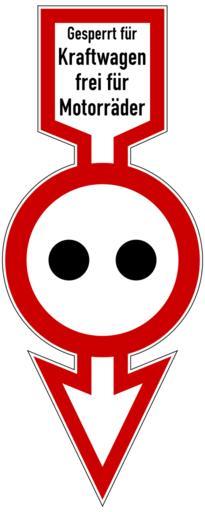 | View Original: | Historisches deutsches Verkehrszeichen Gesperrt für Kraftwagen frei für Motorräder.SVG (720x1800) | |||