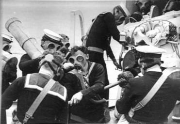 | Keywords: HMAS Adelaide 6 inch gun crew 1939 AWM 000055.jpeg Gun crew of Australian cruiser HMAS Adelaide wearing gasmasks load a BL 6-inch Mk XII gun <br>The man at left carries a cordite cartridge still in its storage case on his right shoulder <br>See also File HMAS Adelaide 6 inch gun crew 1939 AWM 000047 jpeg for a view of same scene from the other side 000055 NEGATIVE BY D P 1939-10-19 Damien Parer Copyright expired - public domain PD-AustraliaGov HMAS Adelaide ship 1918 BL 6 inch naval gun Mk XII Adelaide Black and white photographs Damien Parer Black and white photographs of people wearing gas masks General Service Respirator Mark IV |