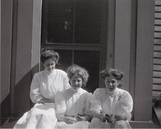 | Keywords: women 1900s clothes indoor blackandwhite black and white "Marjorie R., Marjorie Wilson, E. Creelman" Photograph of three women sitting outside a building. Marjorie Rathbun (1891-1966) was the younger sister of the photographer, Harold McMurrich Rathbun. E. Creelman might be Edith Creelman (born 14 February, 1892), daughter of Adam Creelman, a Toronto lawyer. The photograph was taken in August 1908. "Marjorie R., Marjorie Wilson, E. Creelman" Photograph of three women sitting outside a building. Marjorie Rathbun (1891-1966) was the younger sister of the photographer, Harold McMurrich Rathbun. E. Creelman might be Edith Creelman (born 14 February, 1892), daughter of Adam Creelman, a Toronto lawyer. The photograph was taken in August 1908. |