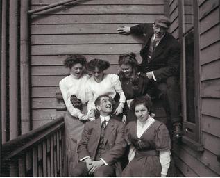 | Keywords: "J. G. Ade, Betty, Marjorie B., Kathleen M M., Jean Masten." John Gzowski, Adrian Rathbun, Betty Caldwell, Marjorie [Braithwaite?], Kathleen McMurrich. Jean Masten was born on 5 November 1895, the daughter of Frances Mary Rathbun (who married Cornelius Arthur Masten, a lawyer from Toronto). Frances was the second child of Edward Wilkes Rathbun and his first wife, Elizabeth How Burt (and hence the photographer's half-sister). This photograph was taken on 11 April 1909. "J. G. Ade, Betty, Marjorie B., Kathleen M M., Jean Masten." John Gzowski, Adrian Rathbun, Betty Caldwell, Marjorie [Braithwaite?], Kathleen McMurrich. Jean Masten was born on 5 November 1895, the daughter of Frances Mary Rathbun (who married Cornelius Arthur Masten, a lawyer from Toronto). Frances was the second child of Edward Wilkes Rathbun and his first wife, Elizabeth How Burt (and hence the photographer's half-sister). This photograph was taken on 11 April 1909. |