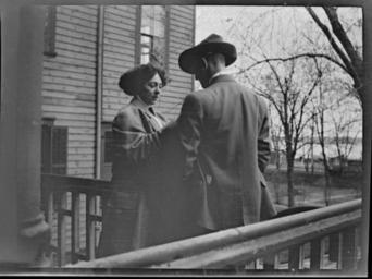 | Keywords: 1900s houses men clothes women blackandwhite monochrome black and white "Adrian & Betty Caldwell Apl 11/09" The photographer's brother, Adrian Rathbun and Betty Caldwell. One of a series of photographs taken on the veranda of the Rathbun house in Main Street, Deseronto, Ontario, on 11 April 1909. "Adrian & Betty Caldwell Apl 11/09" The photographer's brother, Adrian Rathbun and Betty Caldwell. One of a series of photographs taken on the veranda of the Rathbun house in Main Street, Deseronto, Ontario, on 11 April 1909. |