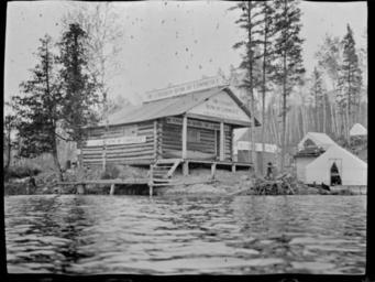 | Keywords: bank buildings bankbuildings canoes 1900s gowganda theatres log cabins logcabins camping blackandwhite monochrome outdoor black and white "Bank of Commerce & Baxters Hotel - Gow Ganda" View of the Canadian Bank of Commerce building in Gowganda, taken from the lake. The bank was built of logs and there is a canoe on the bank's veranda. The building behind the bank has the words SILVER..NO THEATRE just visible upon it. One of a set of photographs from a trip to "Gow Ganda", May 19 - June 28, 1909. "Bank of Commerce & Baxters Hotel - Gow Ganda" View of the Canadian Bank of Commerce building in Gowganda, taken from the lake. The bank was built of logs and there is a canoe on the bank's veranda. The building behind the bank has the words SILVER..NO THEATRE just visible upon it. One of a set of photographs from a trip to "Gow Ganda", May 19 - June 28, 1909. |