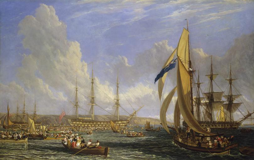 | Keywords: HMS Bellerophon and Napoleon.jpg Artwork Creator John James Chalon HMS Bellerophon anchored in Plymouth Sound with Napoleon Bonaparte aboard Bonaparte had surrendered to Captain Frederick Lewis Maitland of the Bellerophon and been transported to England Pictured are the crowds of people who came out in small boats to see the former emperor when he came out on deck usually at 6 30pm each day Also in the picture are the two frigates Eurotas and Liffey 1816 oil on canvas cm 96 5 153 7 Institution National Maritime Museum Queens House Credit line Greenwich Hospital Collection BHC3227 http //collections rmg co uk/collections/objects/14700 html Royal Museums Greenwitch Other versions PD-old-100 John James Chalon Paintings in the National Maritime Museum London Napoleon on the Bellerophon 1816 Ships of the line of the Royal Navy HMS Bellerophon ship 1786 |