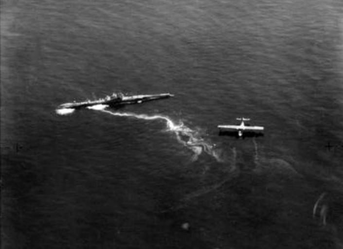 | Keywords: HMS Telemachus (P321) with RAAF Catalina March 1945.jpg Aerial photo of a rendezvous between the British submarine HMS Telemachus P321 and a No 112 Air Sea Rescue Flight RAAF Consolidated Catalina PBY-5A s/n A24-54 in the Banda Sea Netherlands East Indies 23 March 1945 An engineer officer injured in an accident was transferred from the submarine to the Catalina by dinghy and flown to Darwin Australia for emergency surgery P01619 007 1945-03-23 The photo was taken with an F28 camera from No 21 Squadron RAAF Consolidated Liberator s/n A72-66 flown by Squadron Leader Ken Bowman at an altitude of 300 m Image copyright Copyright expired - public domain frame cropped 06 40 00 S 123 10 00 E PD-Australia HMS Telemachus P321 Consolidated Catalina RAAF World War II in March 1945 Black and white photographs |