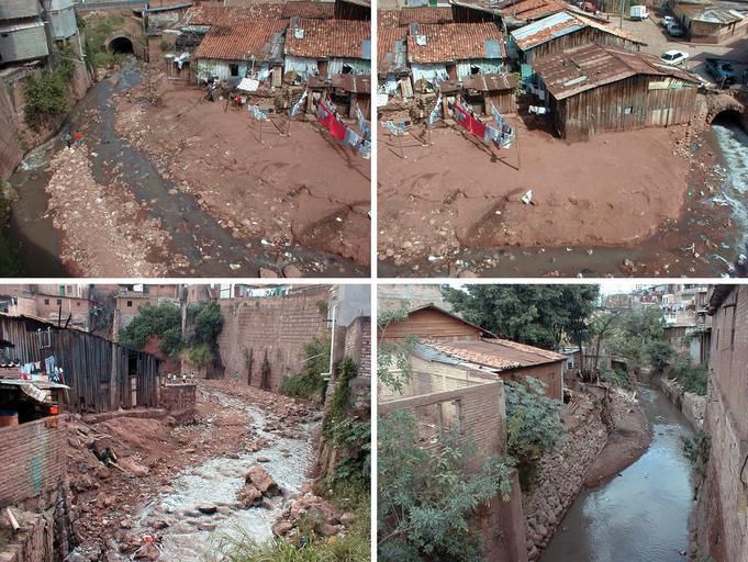 Keywords: HN99cTeguci RioMidTwnU.jpg Three photos from what I call The Bug U with the lowerleft shot taken further upstream <br> Camera Info OLYMPUS SR83 Digital<br> Contact creator at http //Stockhausen yojoa org - This image is also available there under the directory link <u>Composite Group 01</u> as a multi-layer xcf file own 1999 Zack Clark ZackClark Tegucigalpa Poverty in Honduras Rivers of Honduras Montages of cities in Honduras