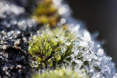 Keywords: hoarfrost moss winter snow cold transition autumn frozen sugar melted crystals green white transparent nature plant flora macro