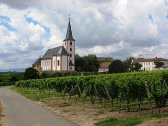 | Keywords: HochheimStPeterPaulKirchenstück.JPG de Blick von Osten über die Spitzenweinlage Hochheimer Kirchenstück zur katholischen Kirche St Peter und Paul; rechts daneben das Küsterhaus über dem Stadttor und das Hauptgebäude der Weinbergschule Grundschule Das Haus links neben der Kirche war früher ein Domänengebäude der Hessischen Staatsweingüter Am Horizont erhebt sich der Kamm des Rheingaugebirges own Brühl 2009-07-11 Hochheim am Main Vineyards of Hochheim am Main | ||||