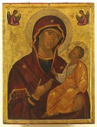 | Keywords: Hodegitria (16th c., Cretan school).jpg Παναγία Οδηγήτρια ρώτες δεκαετίες του 16ου αιώνα 55 5x73εκ άγνωστος Κρητικός ζωγράφος ήτη Ρ Θ εο Υ Στην εικόνα αριστάνεται η Παναγία σε ροτομή ου κρατεί τον Χριστό στο αριστερό της χέρι και έχει το δεξί χέρι μ ροστά στο στήθος Ο Χριστός στρέφει το βλέμμα ρος αυτήν ευλογεί και κρατεί κλειστό ειλητό Ε άνω στις γωνίες εικονίζονται οι αρχάγγελοι ιχαήλ και Γαβριήλ ημίσωμοι και με καλυμμένα τα χέρια σε στάση ροσκύνησης http //eib xanthi ilsp gr/gr/icons asp cursort iconTitle selectFieldValue vpage 2 16th c unidentified Cretan painter PD-old Files uploaded by Shakko from various sources 16th-century icons of Greece Cretan School Marian icons in Greece Hodegetria |