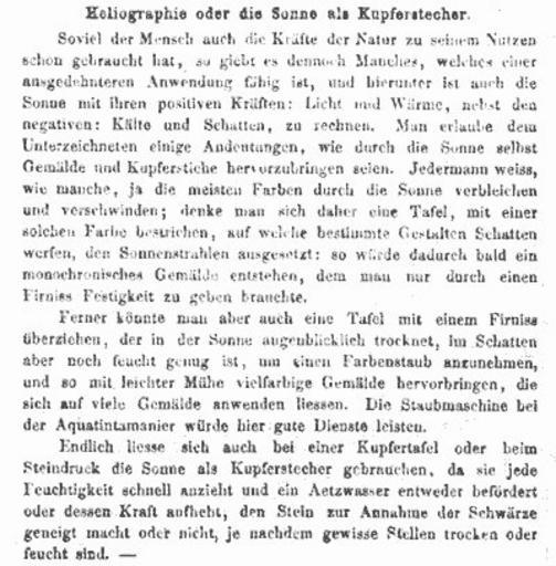 | Keywords: Hoffmeister (Roth 1863).jpg Extract from an article by Roth on the 'Hoffmeister Process' Photographisches Archiv 1863 Reproduction of a text published in 'Allgemeiner Anzeiger der Deutschen' Pierre Harmant extract cited Anno Lucis 1839 http //www marillier nom fr/collodions/PGH/anno_lucisEN2 html 2 Teil Camera Luzern Nr 8 August 1960 Review Extract-pic K de Roth Hat ein deutscher Pfarrer die Photographie erfunden Photographisches Archiv 1863 S 53-57 Orig Work Hoffmeister Die Heliographie oder die Sonne als Kupferstecher Allgemeiner Anzeiger und Nationalzeitung der Deutschen 7 November 1833 Nr 304 S 3816 1863 Philipp Hoffmeister 1804-1874 PD-old Philipp Hoffmeister |
