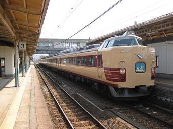Keywords: Hokuetsu.JPG JR East 485 series set T18 on a Hokuetsu limited express service at Niitsu Station ja 国鉄色に戻されたT18編成 新津駅にて Own もんじゃ Monja 2008-08-12 JNR 485 JR East Niitsu Station Hokuetsu