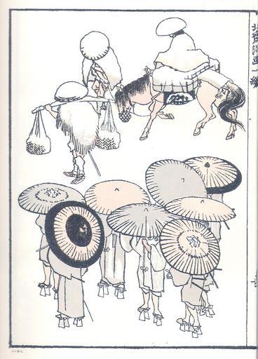 | Keywords: Hokusai Manga 01.jpg A page from Hokusai Manga Michener James A 1958 Hokusai Sketchbooks Selections from the Manga Rutland Vermont Tokyo Charles E Tuttle Company Early 19th century Creator Katsushika Hokusai PD-old-100 Hokusai manga Karakasa in art Kasa hat in art |