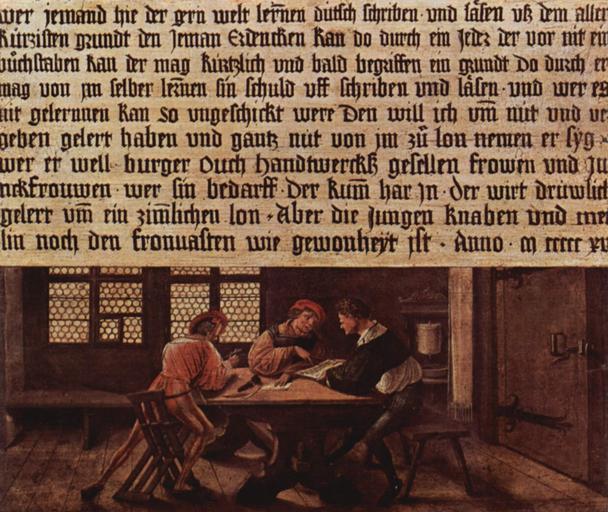 View Original:holbein_school_teacher_explaining_meaning_letter_illiterate_workers_1516.jpg (1576x1328)