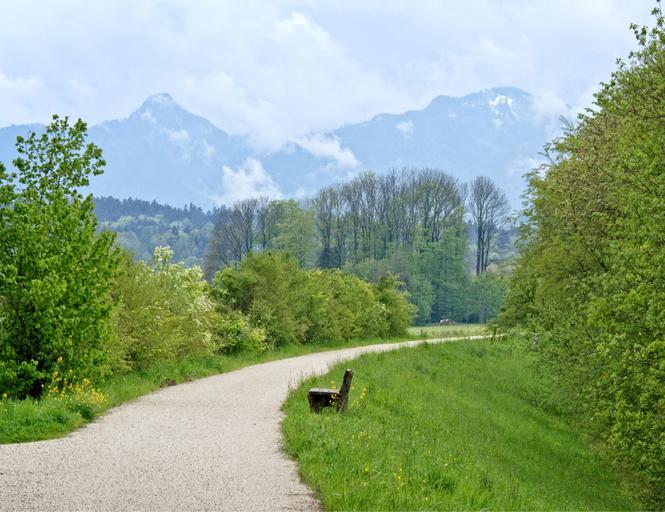 Keywords: holiday leisure recovery hiking lane road away nature meadow green wide distant landscape bavaria chiemgau mountains