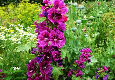 Keywords: hollyhock plant flower garden seed pods poppy seed pods growing blooming petal purple green yellow white
