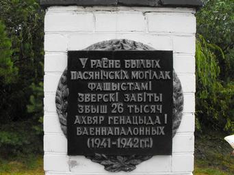 | Keywords: Holocaust in Pinsk 3e.jpg ru Памятник в айоне бывшей де евни Посеничи Посяничи на ок аине Пинска на месте массовых убийств ев еев Пинска и военнопленных в 1941-42 годах а этом месте были убиты 8000 ев еев-мужчин из Пинска аходится на выезде из Посенич в нап авлении Пинска по до оге Р6 слева от шоссе пе ед де евней Галево 2012-07-12 own Avner 52 10 09 8 N 26 05 21 5 E heading E cc-zero Holocaust in Pinsk Ghetto Pinsk Uploaded with UploadWizard | ||||