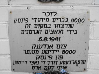 | Keywords: Holocaust in Pinsk 3f.jpg ru Памятник в айоне бывшей де евни Посеничи Посяничи на ок аине Пинска на месте массовых убийств ев еев Пинска и военнопленных в 1941-42 годах а этом месте были убиты 8000 ев еев-мужчин из Пинска аходится на выезде из Посенич в нап авлении Пинска по до оге Р6 слева от шоссе пе ед де евней Галево 2012-07-12 own Avner 52 10 09 8 N 26 05 21 5 E heading E cc-zero Uploaded with UploadWizard Holocaust in Pinsk Ghetto Pinsk | ||||