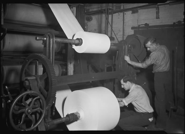 | Keywords: Holyoke, Massachusetts - Paper. American Writing Paper Co. Super calender. - NARA - 518338.jpg Scope and content General notes 518338 Local identifier 69-RP-49 Federal Works Agency Work Projects Administration National Research Project ca 1941 - ca 1942 NARA-Author Hine Lewis Wickes 1874-1940 Photographer 1122914 <br /> Still Picture Records Section Special Media Archives Services Division NWCS-S National Archives at College Park 8601 Adelphi Road College Park MD 20740-6001 1936 - 1937 Record group Record Group 69 Records of the Work Projects Administration 1922 - 1944 Record group ARC 398 Lewis Hine Photographs for the National Research Project compiled 1936 - 1937 Series ARC 518291 File unit File unit ARC Variant control numbers NAIL Control Number NWDNS-69-RP-49 Other versions <gallery> File Mt _Holyoke _Massachusetts_-_Paper _American_Writing_Paper_Co _Super_calender _-_NARA_-_518338 tif tif File Mt _Holyoke _Massachusetts_-_Paper _American_Writing_Paper_Co _Super_calender _-_NARA_-_518338 jpg jpg </gallery> NARA-cooperation PD-USGov Holyoke Massachusetts Men at work in the United States |