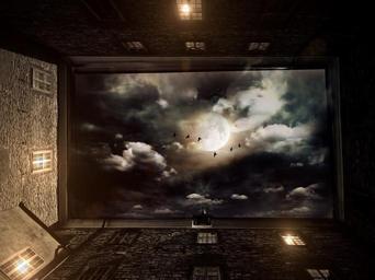 Keywords: home courtyard window sky perspective night moon clouds ghostly light lamps birds mood building architecture high hof facade lighting