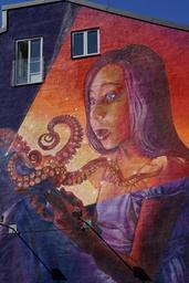 Keywords: home housewife painted painting artfully art building facade hauswand mural modern colorful woman marvel amazed squid octopus tentacle read book