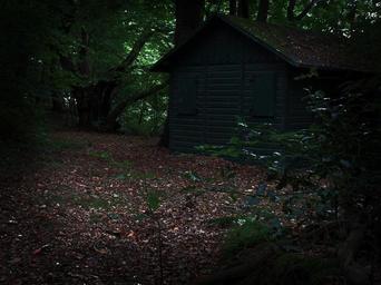Keywords: home hut forest hunting house gloomy creepy crime scene dark spooky evening twilight leave shelter halloween forest lodge forest house