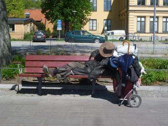 Keywords: homeless stockholm drifter park bench hat packing street norrmälarstrand