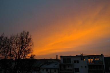 Keywords: homes church steeple abendstimmung sunset sky stripes orange twilight tree
