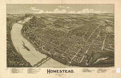 | Keywords: Homestead, Pennsylvania, 1902 WDL9574.png Artwork ru Фауле Т Таддеус о тиме 1842-1922 гг fr Fowler T M Thaddeus Mortimer 1842-1922 en Fowler T M Thaddeus Mortimer 1842-1922 zh 赛迪斯·莫蒂默·福勒,1842-1922 年 pt Fowler T M Thaddeus Mortimer 1842-1922 ar فاولر، ت م ثاديوس مورتيمر ، 1842-1922 es Fowler T M Thaddeus Mortimer 1842-1922 ru Хоумстед штат Пенсильвания 1902 г fr Homestead en Pennsylvanie 1902 en Homestead Pennsylvania 1902 zh 宾夕法尼亚州 姆斯泰德,1902 年 pt Homestead Pensilvânia 1902 ar هومستيد، بنسلفانيا، 1902 ru а этой пано амной ка те показан Хоумстед штат Пенсильвания в том виде какой он имел в 1902 г Хоумстед был местом асположения к упного сталелитейного завода п инадлежавшего Энд ю Ка неги где в 1892 г в езультате конфликта между компанией Carnegie Steel Company и п офсоюзом сталелитейщиков п оизошла к овавая забастовка В пе ечне обозначений в нижней части ка ты указаны п едставляющие инте ес места в том числе сталелитейный завод и д угие к упные п омышленные объекты железнодо ожные станции школы це кви и го одская Библиотека Ка неги Количество и азнооб азие культовых зданий синагога и це кви п есвите ианской баптистской люте анской польской католической немецкой католической литовской католической уэльской баптистской аф иканской методистской епископальной A M E и д угих конг егаций от ажают этническую асовую и елигиозную азно одность го ода Пано амная ка та являлась ка тог афической фо мой кото ую ши око использовали для изоб ажения аме иканских и канадских к упных и мелких го одов в конце XIX и в начале XX века Также называемые видами с высоты птичьего полета или пе спективными ка тами они п едставляют изоб ажения го одов как будто п и осмот е све ху под ост ым углом Обычно не выче чиваемые в масштабе ка ты показывают асположение улиц отдельные здания и главные особенности пейзажа в пе спективе Эта ка та является аботой Таддеуса о тиме а Фауле а 1842 1922 гг одного из наиболее известных составителей пано амных ка т <br>Аэ офотоснимки; Го ода и поселки; Река ононгахела штаты Западная Ви джиния и Пенсильвания ; Пано амные виды fr Cette carte panoramique d'Homestead en Pennsylvanie montre la ville telle qu'elle était en 1902 Homestead était le site d'une importante aciérie détenue par Andrew Carnegie C'était aussi le théâtre d'une grève sanglante survenue en 1892 faisant suite à un conflit entre la Carnegie Steel Company et le syndicat des métallurgistes L'index au bas indique les points d'intérêt notamment les aciéries et d'autres installations industrielles importantes les gares ferroviaires les écoles les églises et la bibliothèque Carnegie de la ville Les lieux de culte nombreux et variés une synagogue et des églises pour les congrégations presbytérienne baptiste luthérienne catholique polonaise catholique allemande catholique lituanienne baptiste galloise épiscopale méthodiste africaine A M E et autres reflètent la diversité ethnique raciale et religieuse de la ville La carte panoramique était un type de carte communément utilisé pour représenter des villes américaines et canadiennes vers la fin du XIX<sup>e</sup> et le début du XX<sup>e</sup> siècle Également connues sous le nom de vues aériennes ou cartes de vue en perspective elles représentent les villes vues d'en haut et en oblique Pas toujours dessinées à l'échelle les cartes révèlent le tracé des rues les bâtiments individuels ainsi que les caractéristiques essentielles du paysage en perspective Cette œuvre est de Thaddeus Mortimer Fowler 1842-1922 l'un des concepteurs de cartes panoramiques les plus prolifiques <br>Vues aériennes; Petites et grandes villes; Rivière Monongahéla Virginie-Occidentale et Pennsylvanie ; Vues panoramiques en This panoramic map shows Homestead Pennsylvania as it appeared in 1902 Homestead was the site of a major steel mill owned by Andrew Carnegie and of a bloody strike in 1892 resulting from a dispute between the Carnegie Steel Company and the steelworkers union The index at the bottom indicates points of interest including the steel works and other major industrial facilities railroad stations schools churches and the city s Carnegie Library The number and variety of houses of worship a synagogue and churches for Presbyterian Baptist Lutheran Polish Catholic German Catholic Lithuanian Catholic Welsh Baptist African Methodist Episcopal A M E and other congregations reflects the ethnic racial and religious diversity of the city The panoramic map was a cartographic form in popular use to depict U S and Canadian cities and towns in the late 19th and early 20th centuries Also known as bird's-eye views or perspecti