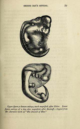 | Keywords: Homo versus Darwin (Page 39) (5693419011).jpg SECOND day's SITTIKG <br> 39 <br> Upper figure a human embryo much magnified after HcTcer Lower <br> figure embryo of a dog also magnified after Bischojf ” Copied from <br> Mr Darwin's work on The Descent of Man 33407717 104303 49323 Page 39 Text http //www biodiversitylibrary org/page/33407717 1871 10 5962/bhl title 49323 Lyon William Penman Biodiversity Heritage Library TWITTER POSTS Charles Darwin human embryo dog embryo Darwin Descent of Man descent of man Information field Flickr posted date ISOdate 2011-05-06 PD-old-70-1923 Homo versus Darwin Photos uploaded from Flickr by Fæ using a script Files from the Biodiversity Heritage Library released as Attribution-NonCommercial-ShareAlike |