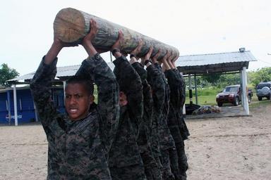| Keywords: Honduran Fuerza Especiales Naval with a trunk.jpg Honduran Fuerza Especiales Naval FEN candidates use teamwork to perform physical training exercises with a heavy log at a local beach in Honduras in the fall of 2012 Log physical training exercises were one of many physically demanding exercises as part of two eight-week Basic Underwater Demolition/SEAL-style selection courses conducted by members of the U S Naval Special Warfare Task Element-Alpha in order to assist their Honduran counterparts establish this elite unit within the Honduran military The FEN is a maritime unit of special operators capable of combating transnational organized crime in and around their waterways U S Navy Photo by ITC Gino Rullo Naval Special Warfare Unit-FOUR http //www arsouth army mil/news/southcomnews/4626-us-navy-special-forces-help-honduras-form-elite-counter-trafficking-force html Gino Rullo PD-USGov-Military-Navy Special forces of Honduras |