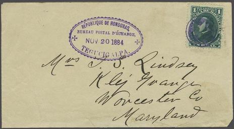 Keywords: Honduras 1884 cover.JPG en 1884 covers bearing 1878 Morazan issue 1 r green used to USA and cancelled in violet at Tegucigalpa 1884 November 20 Scan of original Government of Honduras PD-old-100 Covers of Honduras Francisco Morazán