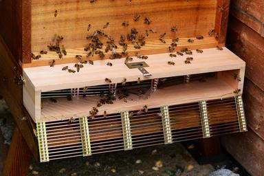 Keywords: honey bee swarm trap bees hive cedar wood open trap queen trap close-up detail