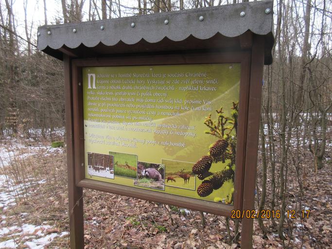 Keywords: Honitba Slunečná.JPG cs Tabule označující honitbu ve Slunečné 2016-02-20 12 17 50 own Zákupák other versions cc-zero Slunečná Česká Lípa District Plaques in Česká Lípa District
