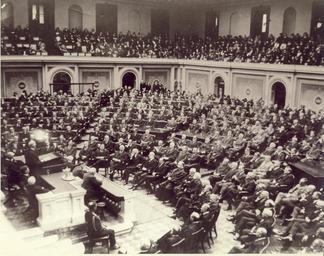 | Keywords: president wilson congress house honor memorial auditorium hall Local Accession Number: 2373 Description: Prominent personages of at least four administrations gathered in the chamber of the House of Representatives to pay official tribute to the memory of Woodrow Wilson. Beginning at left: Herbert Hoover, Dr. Hubert Work, Curtis Wilbur, Harry S. New, Harlan F. Stone, John W. Weeks, Andrew W. Mellon, Charles Evans Hughes, President Coolidge, William Howard Taft and Members of the Supreme Court. In second row (right) reading from aisle (left to right): William Jennings Bryan, Robert Lansing, E.T. Heredith, A. Mitchell Palmer, Josephus Daniels, John Barton Payne, Wm. Redfield, William B. Wilson, Joseph Tumulty, all members of Wilson's cabinet (Tumulty secretary). Dr. Edwin A. Alderman, President of UVA, Wilson's college, is speaking. Mrs. Wilson and other close friends were also in attendance. Photographer: Unknown Source: Donated by Mr. and Mrs. Bert Adams Size: 10x8 Medium: Print, Black and White Date: 12-15-1924 Local Accession Number: 2373 Description: Prominent personages of at least four administrations gathered in the chamber of the House of Representatives to pay official tribute to the memory of Woodrow Wilson. Beginning at left: Herbert Hoover, Dr. Hubert Work, Curtis Wilbur, Harry S. New, Harlan F. Stone, John W. Weeks, Andrew W. Mellon, Charles Evans Hughes, President Coolidge, William Howard Taft and Members of the Supreme Court. In second row (right) reading from aisle (left to right): William Jennings Bryan, Robert Lansing, E.T. Heredith, A. Mitchell Palmer, Josephus Daniels, John Barton Payne, Wm. Redfield, William B. Wilson, Joseph Tumulty, all members of Wilson's cabinet (Tumulty secretary). Dr. Edwin A. Alderman, President of UVA, Wilson's college, is speaking. Mrs. Wilson and other close friends were also in attendance. Photographer: Unknown Source: Donated by Mr. and Mrs. Bert Adams Size: 10x8 Medium: Print, Black and White Date: 12-15-1924 |