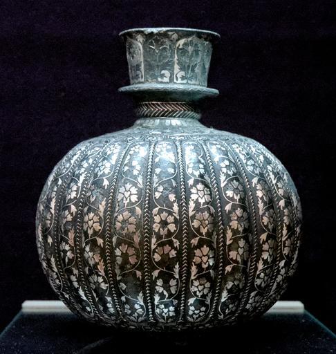 Keywords: Hookah base Louvre MAO739.jpg Hookah base Base de houka turn of the century 18 polished and blackened alloy of copper zinc lead and tin inlaid with silver alliage de zinc cuivre plomb et étain poli et noirci incrusté d'argent Institution Louvre object department Islamic art 26379 object history RelativeLocation Deccan Plateau India credit line ProvenanceEvent purchase 1984 accession number Louvre number 739 Marie-Lan Nguyen 2006 other versions Hookahs Mughal art Bidriware Objects with black background Mughal art in the Louvre Museum |
