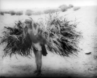 | Keywords: Hopi Indian farmer, Lomay Ohungyoma, carrying corn fodder on his back, ca.1887 (CHS-5036).jpg en <br> Hopi Indian farmer Lomay Ohungyoma carrying corn fodder on his back ca 1887 Photograph of a Hopi Indian farmer Lomay Ohungyoma carrying corn fodder on his back on his way to the fields ca 1887 He grimaces under the heavy load He has a strap wrapped around his forehead that helps support the weight of the load He wears a loincloth and moccasins He has long straight hair cropped straight just above his shoulders A small rise dotted with scrub brush is visible blurred behind him Call number CHS-5036 Photographer James George Wharton; Maud Photo Pasadena California Filename CHS-5036 Coverage date circa 1887 Part of collection California Historical Society Collection 1860-1960 Type images Part of subcollection Title Insurance and Trust and C C Pierce Photography Collection 1860-1960 Repository name USC Libraries Special Collections Format glass plate negatives Microfiche number 1-168- Archival file chs_Volume98/CHS-5036 tiff Repository address Doheny Memorial Library Los Angeles CA 90089-0189 Geographic subject country USA Format aacr2 3 photographs glass photonegative photoprints b w ; 21 x 26 cm Rights Digitally reproduced by the USC Digital Library; From the California Historical Society Collection at the University of Southern California Subject adlf tribal areas Accession number 5036 Repository email specol usc edu Contributing entity California Historical Society Date created circa 1887 Publisher of the digital version University of Southern California Libraries Format aat photographic prints; photographs Legacy record ID chs-m17284; USC-1-1-1-13518 Access conditions Send requests to address or e-mail given Phone 213 821-2366; fax 213 740-2343 Subject file heading Indians -- Hopi -- General Subject lcsh Indians of North America; Hopi Indians; Clothing and dress Subject Ohungyoma Lomay; Hopi Indians circa 1887 date created George Wharton James 1858 1923 http //digitallibrary usc edu/cdm/ref/collection/p15799coll65/id/17286 PD-old-70-1923 Images from USC Digital Library uploaded by Fæ Photographs by George Wharton James California Historical Society Collection 1860-1960 Glass plate negatives Hopi men |