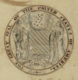 | Keywords: HopkinsonGreatSealDesignObverse.jpg in the committee's final report was <blockquote>The Shield charged on the Field Azure with 13 diagonal stripes alternate rouge and argent ” Supporters; dexter a Warriour holding a Sword; sinister a Figure representing Peace bearing an Olive Branch ” The Crest ” a radiant Constellation of 13 Stars ” The motto Bella vel Paci For war or for peace </blockquote> This was a modification of a design made by Hopkinson a few days previously where the warrior was depicted as an American Indian with a bow and arrow Extracted from PDF version of http //diplomacy state gov/exhibitions/onlineexhibitions/100935 htm Creating the Great Seal poster part of a U S Diplomacy Center State Department exhibition on the 225th anniversary of the Great Seal Direct PDF URL http //diplomacy state gov/documents/organization/101210 pdf 18MB <br/> Courtesy of the National Archives 1780 Francis Hopkinson The http //diplomacy state gov/exhibitions/onlineexhibitions/100935 htm U S Diplomacy Center exhibition page states All materials in this exhibition are in the public domain and can be reproduced without permission Citation of this source is appreciated NARA-image 595252 <gallery>File HopkinsonGreatSealDesignReverse jpg Reverse side of this design</gallery> PD-old-100 Great Seal of the United States Francis Hopkinson |
