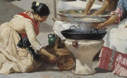 | Keywords: Hornillo, perula y dos lebrillos.jpg es Alfarería y loza popular andaluza en el cuadro Vendedoras de rosquillas en una calle de Sevilla detalle En primer plano un gran anafre u hornillo con la paella de hierro encima y detrás los dos lebrillos uno mediano que contiene la harina y otro grande donde se va haciendo la masa; en el suelo una botija perulera esmaltada en verde conteniendo el aceite en Rosquilla Sellers in a Corner of Seville except Oil on canvas 107 x 81 cm Inv CTB 1987 29 File Manuel Wssel de Guimbarda Vendedoras de rosquillas en Sevilla - ca 1880 jpg Institution Museo Carmen Thyssen http //www carmenthyssenmalaga org/en/obra/168 Creator Manuel Ussel de Guimbarda 1881 http //sevillaciudad sevilla abc es/reportajes/casco-antiguo/cultura-casco-antiguo/un-viaje-todo-color-por-la-sevilla-costumbrista/ PD-old-100 Paintings by Manuel Ussel de Guimbarda 1907 deaths 1833 births Paintings in the Museo Carmen Thyssen Málaga Street vendors in art 19th-century painters from Spain 1881 in Spain Paintings of Seville Pottery in Spanish painting Lebrillos |