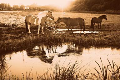 Keywords: horse animal mammal equine fence reflection pond two horses