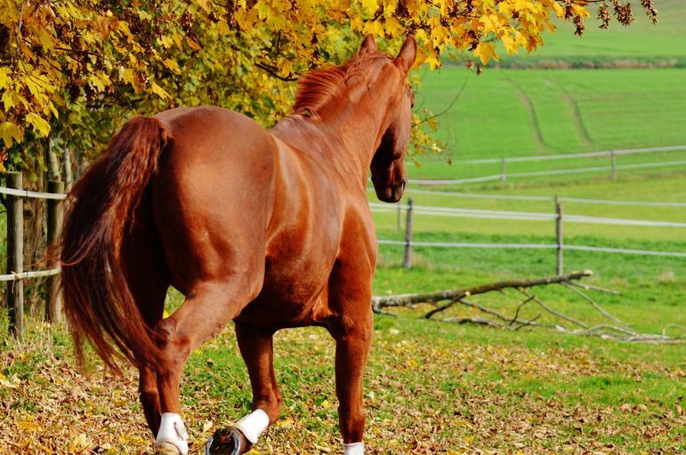 Keywords: horse animal ride reiterhof brown coupling meadow leaves autumn colorful