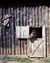 Keywords: horse barn door head ranch animal equine stable rural brown rustic stall face curious