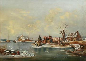 Keywords: Horse-drawn sled.JPG century 19 oil canvas board in 18 25 5 A group of people and their dogs embark on a sleigh ride next to a frozen river Dutch school private collection PD-Art Genre paintings Horse sleighs in art